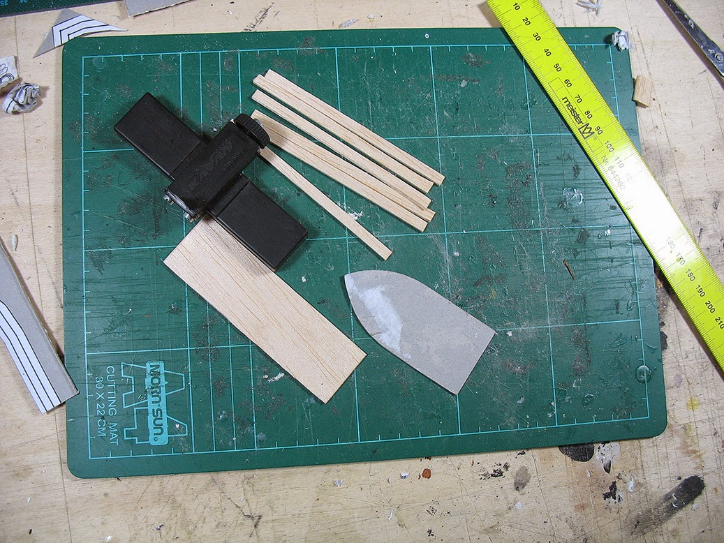 In questo caso io ho ritagliato i listelli da una tavoletta utilizzando un "balsa-stripper". Questo attrezzo permette di ritagliare lungo vena dei listelli sempre della stessa larghezza. Io preferisco usare questo sistema perché in questo modo posso fabbricarmi i listelli alla larghezza che voglio, a seconda della bisogna, ma comunque, in sostituzione potete anche acquistare i listelli già pronti alla larghezza desiderata.